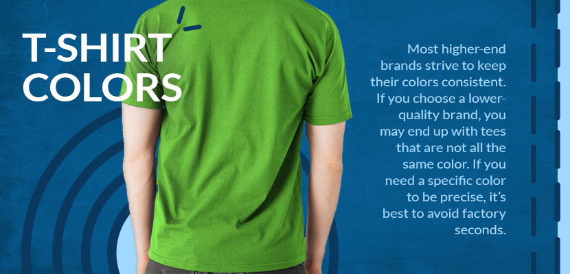 If you are shopping for t-shirts online and need a specific color to be precise, it’s best to avoid factory seconds. Irregulars are usually safe, though, as they only have minor issues that are often not even detectable by the human eye. When you are shopping for shirts in person, make sure the sleeves match the bodies of the shirts, and make sure they are all identical. Also, pay close attention to details like ribbing, where color control tends to be especially difficult.